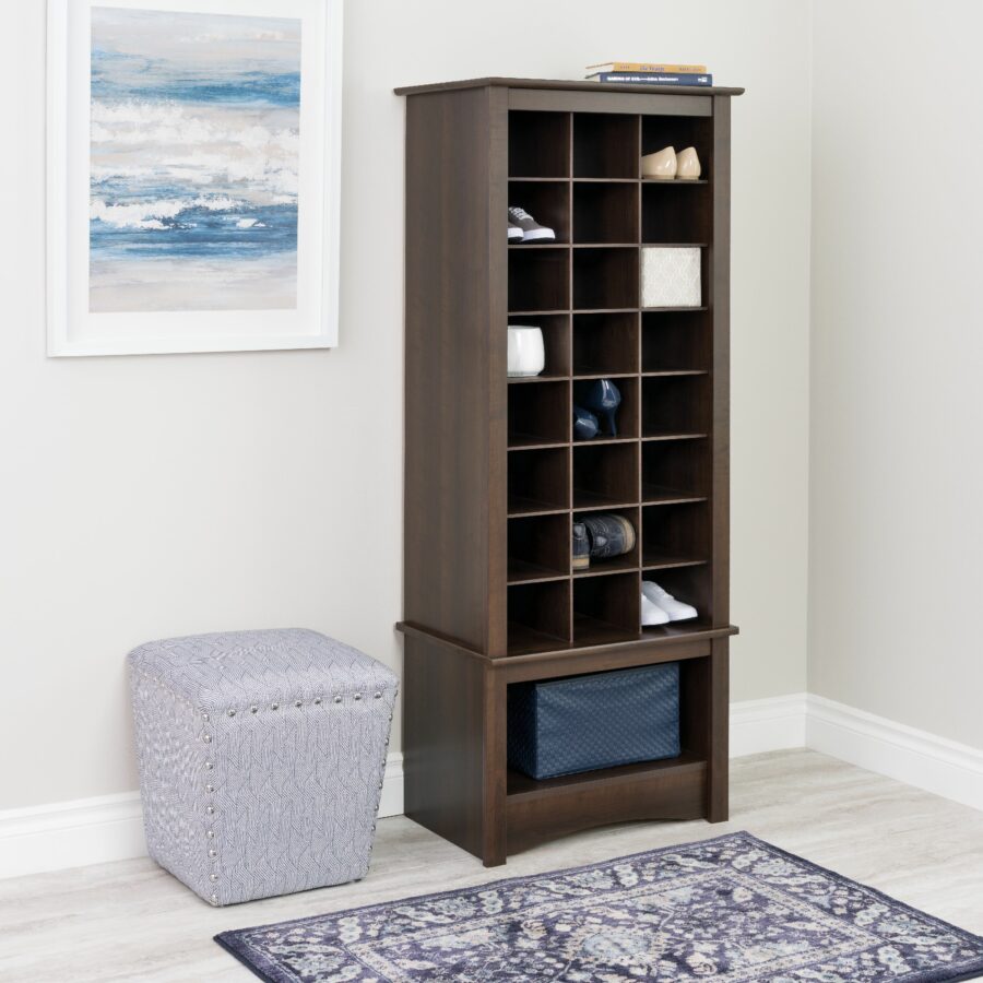 Jangan sembunyikan sepatu favorit Anda di bagian belakang lemari! Lemari Sepatu Kayu Minimalis Prepac Tingkat bergaya kami sangat cocok untuk serambi, ruang keluarga, pintu masuk, atau kamar tidur. Angkat sepatu Anda dari lantai dan tertata rapi dengan fungsionalitas rak built-in khusus dengan harga terjangkau. Kabinet ini memiliki 24 kubus luas yang dapat memuat sepatu ukuran 13 pria dan kompartemen bawah yang besar untuk sepatu bot, tas, atau bahkan keranjang untuk menyimpan aksesoris seperti syal atau sarung tangan. Dibuat dengan kayu solid tahan lama.