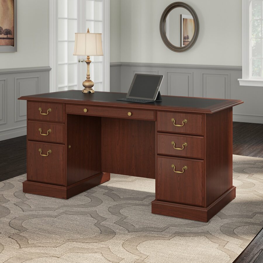 Meja Kerja Kayu Saratoga menawarkan tampilan mewah dengan nilai yang tahan lama. Surat pena, bayar tagihan, atau lengkapi rumah atau kantor profesional Anda dengan Meja Kerja Kayu Saratoga yang dibuat untuk penggunaan sehari-hari. Meja Kerja Kayu Saratoga tahan lama selama bertahun-tahun sekaligus menahan goresan dan noda. Sisipan desktop Hitam semakin melindungi permukaan kerja yang lebar dan menyempurnakan hasil akhir Meja Kerja Kayu Saratoga yang hangat. Meja Kerja Kayu Saratoga dengan aksen desain abadi cocok dengan gaya tradisional kantor rumah atau ruang kerja profesional Anda. Tidak hanya untuk penampilan, Meja Kerja Kayu Saratoga berisi tiga laci arsip ekstensi penuh yang meluncur di atas slide bantalan bola yang mulus untuk akses mudah ke konten. Sepasang laci kotak dan laci tengah tempat pensil menampung peralatan tulis dan perlengkapan kantor.