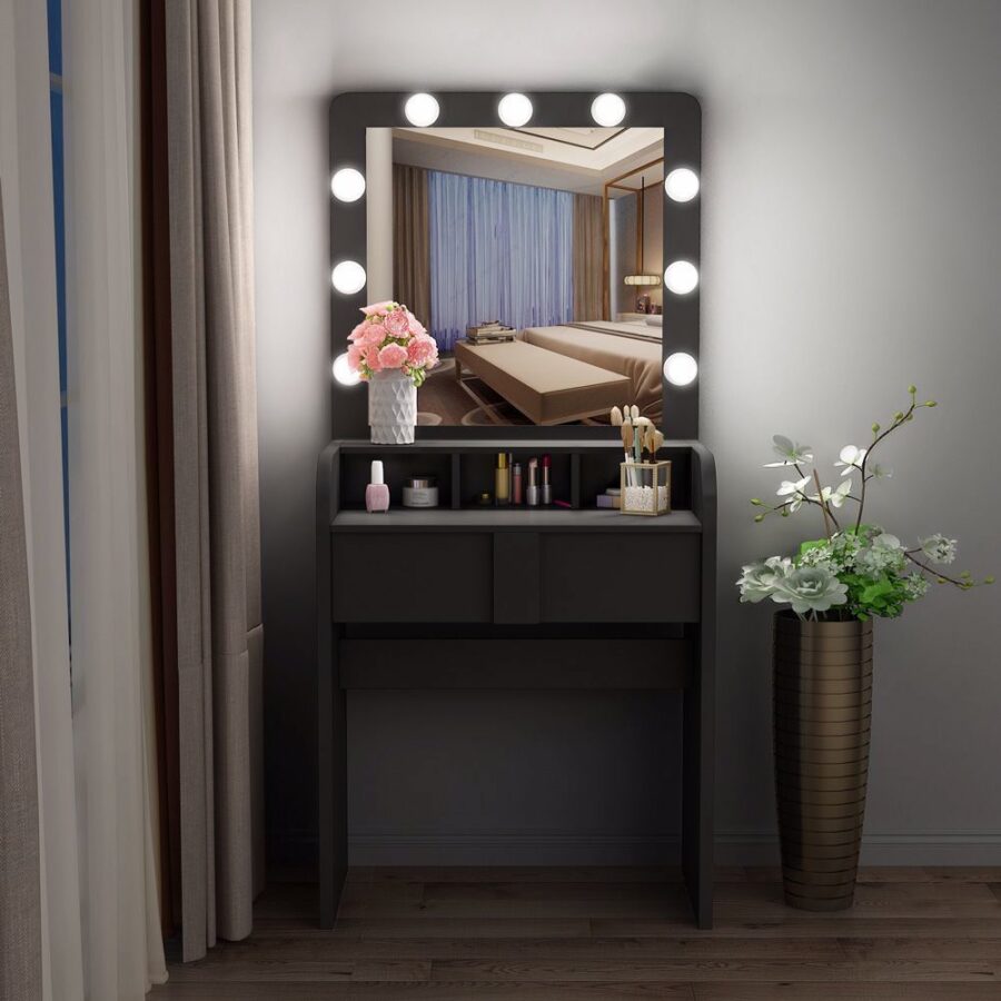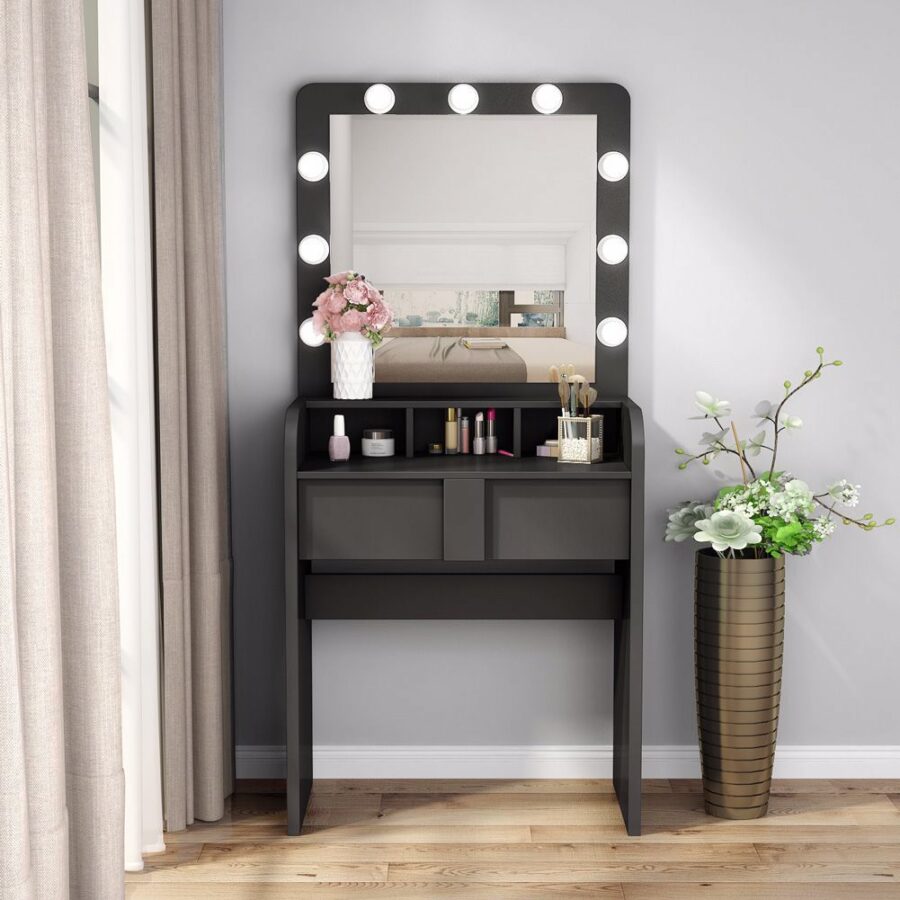 Meja Rias Murah Meriah Tribesigns Kecil dengan Lighted Mirror untuk ruang ganti, Anda bisa bersiap-siap di depan cermin tinggi dan bergaya, fitur dengan 9 leds cool bulks, mudah menata rambut atau makeup dengan meningkatkan visibilitas.
